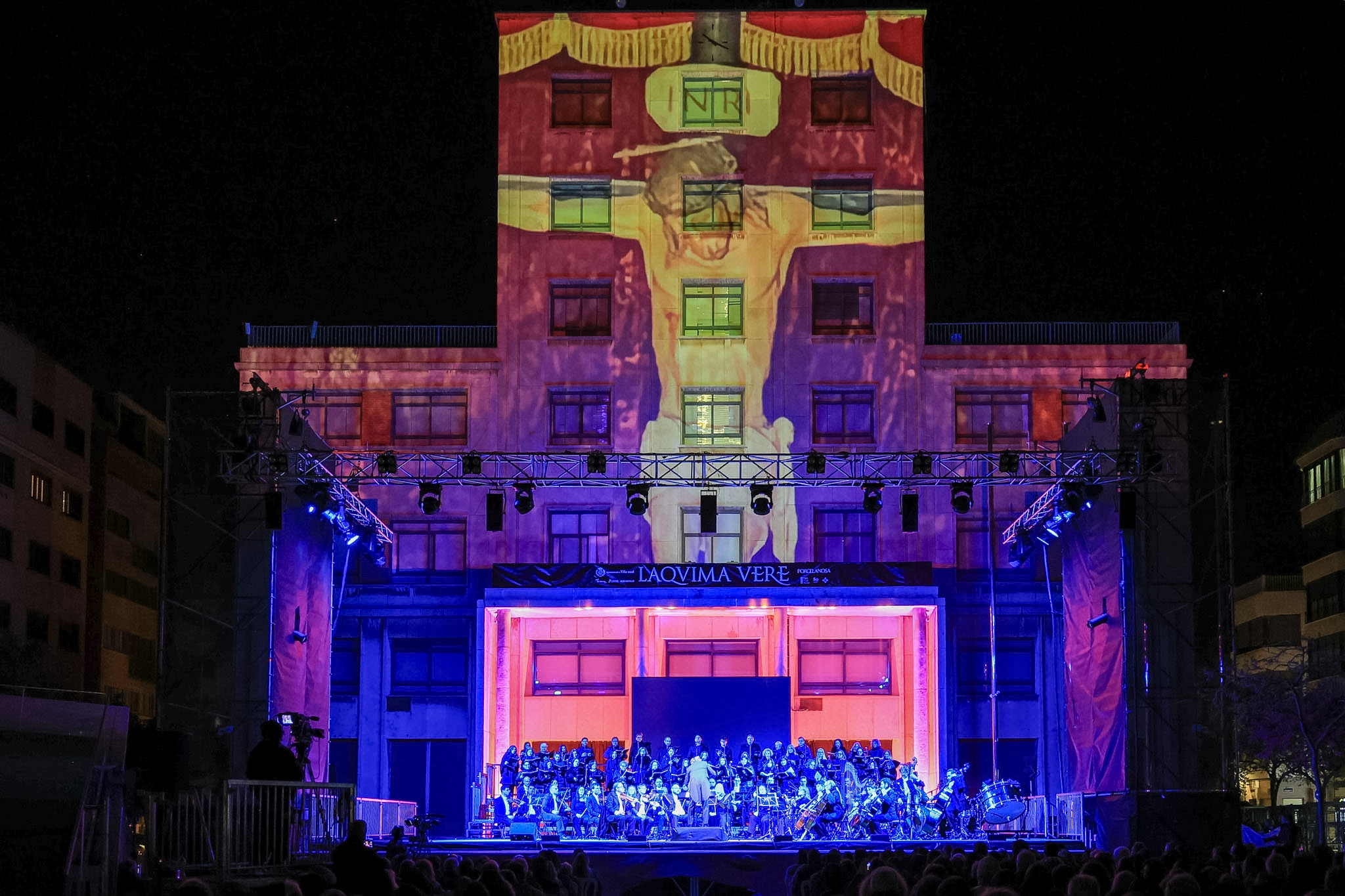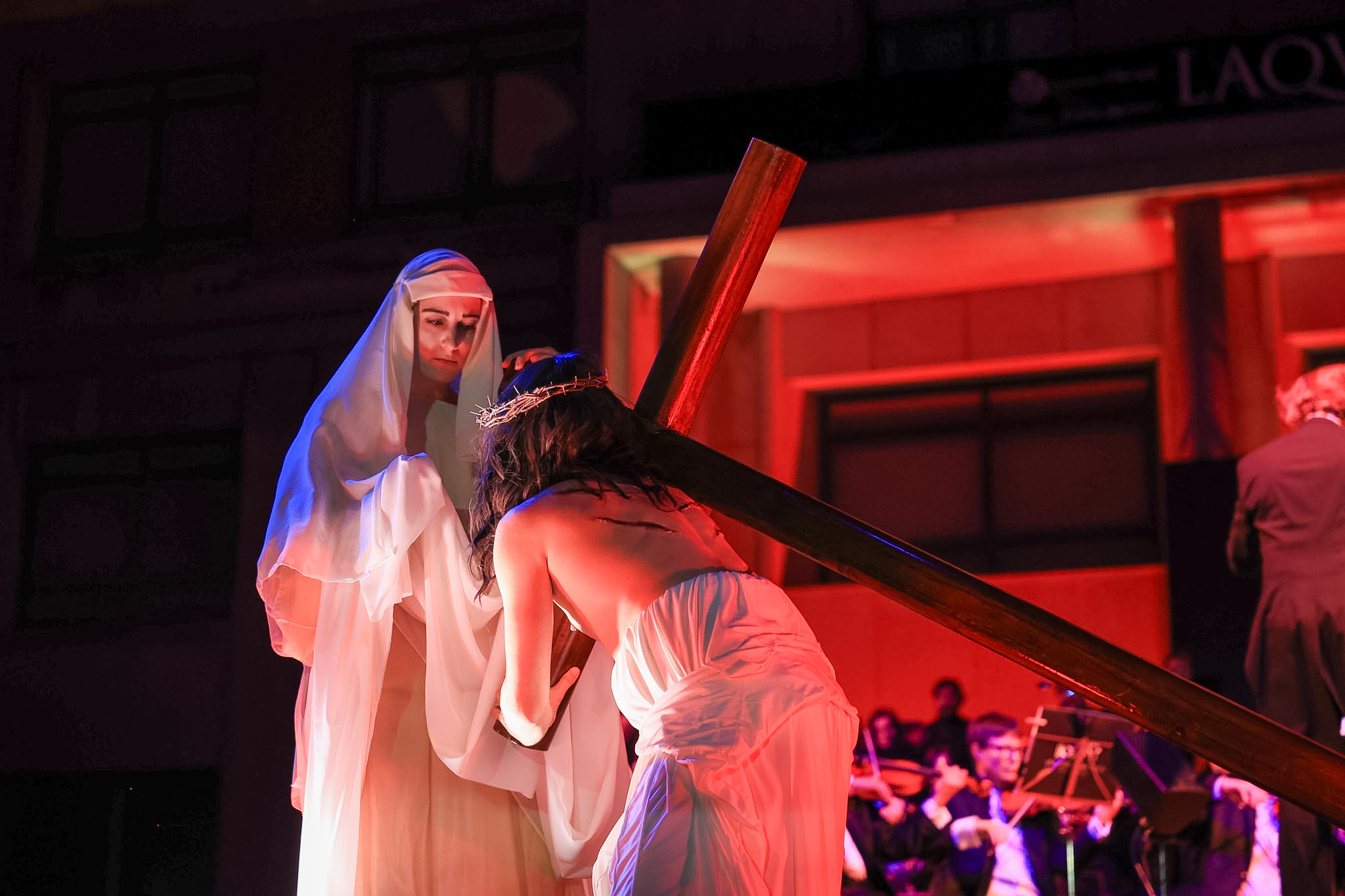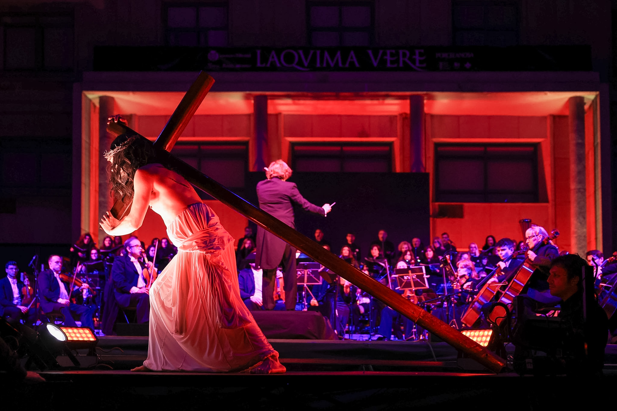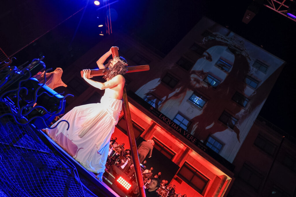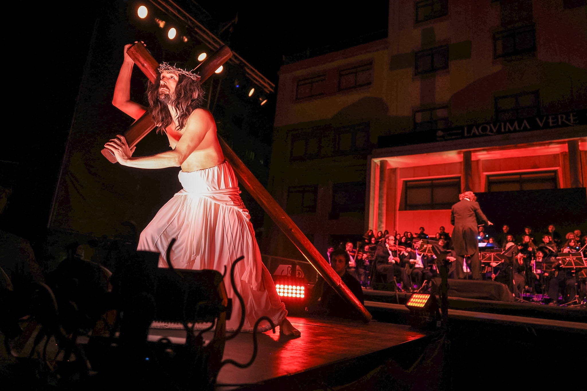 Imatges de la representació de la passió musical “Laquima Vere”, que ha tingut lloc aquesta nit a la plaça Major de Vila -real, en un ambient carregat d’emoció i gran afluència de públic. L’espectacle ha comptat amb la participació de prop de 200 persones, entre artistes i tècnics, que han fet possible una posada en escena acurada, intensa i plena de simbolisme, combinant música, interpretació i escenografia per recrear els moments més significatius de la Passió.