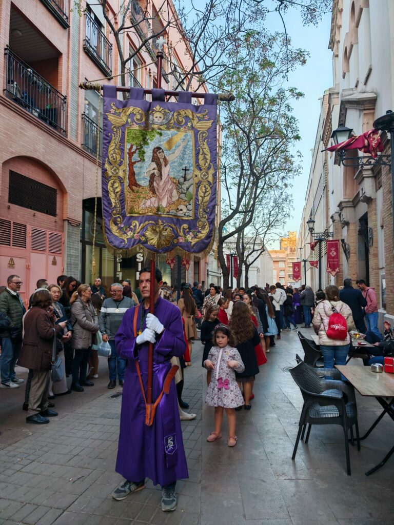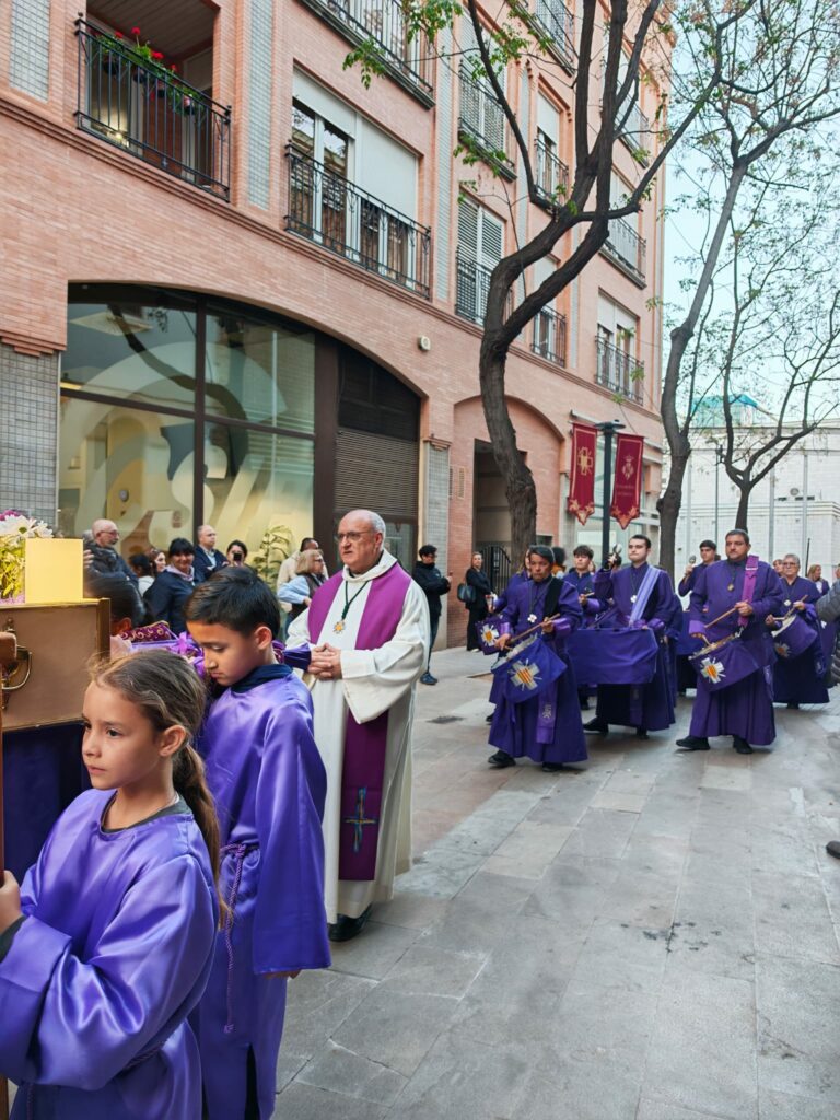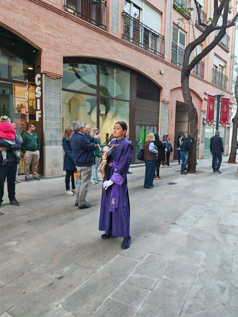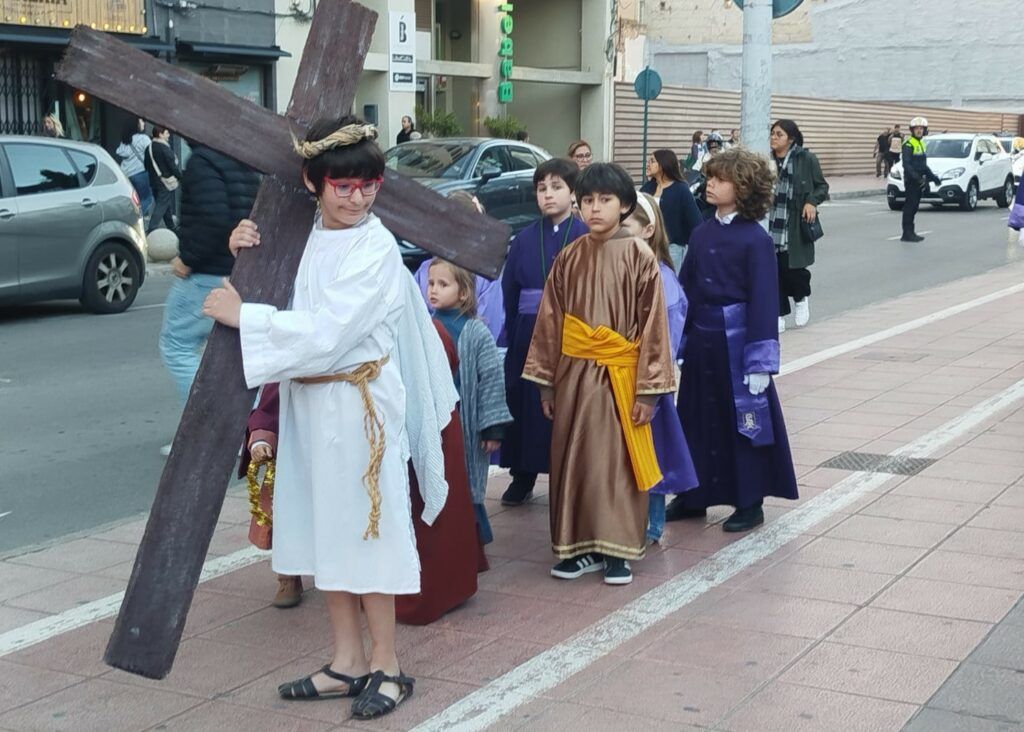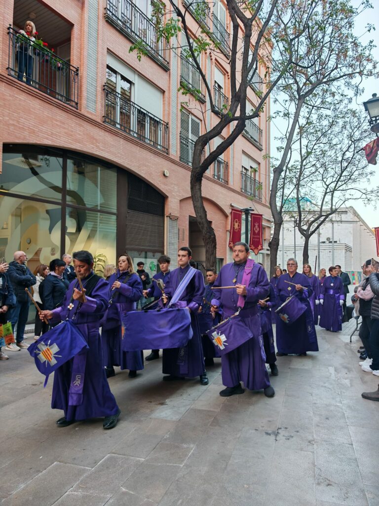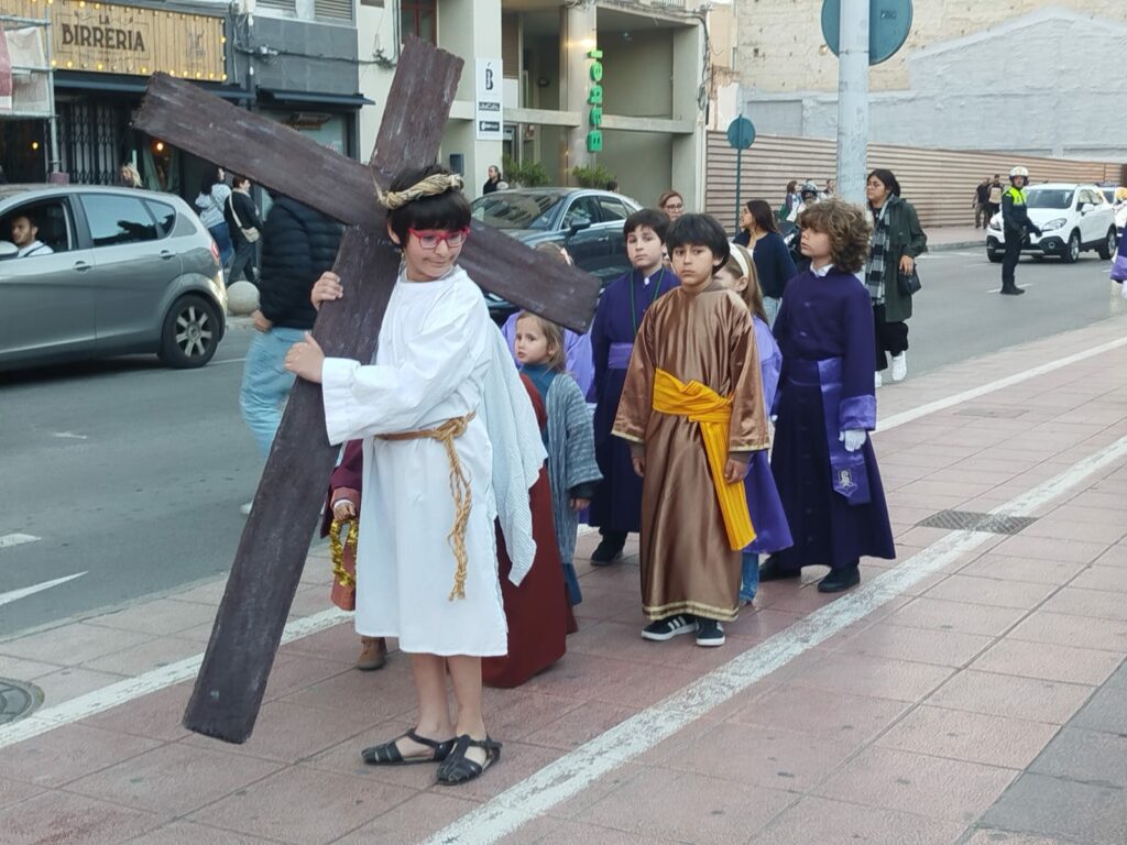 Como toda procesión de Semana Santa, su estandarte h abierto la comitiva. Tras él, acompañantes, y el Cristo con la Cruz, junto a los personajes bíblicos propios de la escena y en el centro, la peana. Una pequeña construcción portada a hombros por barraros que se han ido turnando. Todo ello, bajo la mirada atenta de quienes les dirigían para asegurar que no hubiera ningún desequilibrio. Y todo, como no podía ser de otra manera, al solemne ritmo de la sección de tambores y bombos de la cofradía.