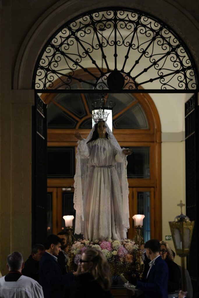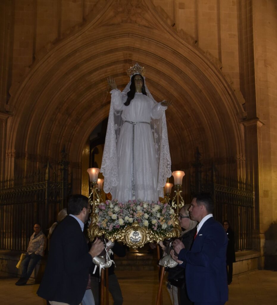 Cuando llega a la concatedral se le abren las puertas un momento para que la imagen pueda entrar, y ya queda allí, lista para el Domingo. Quienes la acompañan, con cirios lo viven de un modo discreto, quizás más íntimo incluso que procesiones con espectadores. No en vano este recorrido es desconocido para quienes no están vinculados con el mundo de las cofradías. Pero en los últimos años, algunos miembros han querido darle visibilidad. Y de una manera también, discreta, parece que pese a la corta distancia y duración de este traslado, de algún modo, para unas pocas personas está recuperando ese sentido.