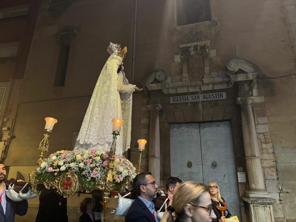 El recorrido es corto, el que separa la plaza de las aulas de la plaza Mayor. Algunos años se ha hecho por la calle Cavallers, este año ha sido por la calle Mayor. Pero de cualquier modo se trata de un traslado sencillo, discreto, en el que apenas algunas decenas de personas acompañan la peana.