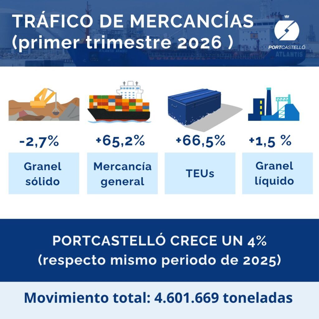 La Autoridad Portuaria de Castellón cierra el primer trimestre de 2026 con un balance positivo, alcanzando un tráfico total acumulado de 4.609.562 toneladas, lo que supone un incremento del 4,16% respecto al mismo periodo del ejercicio anterior.