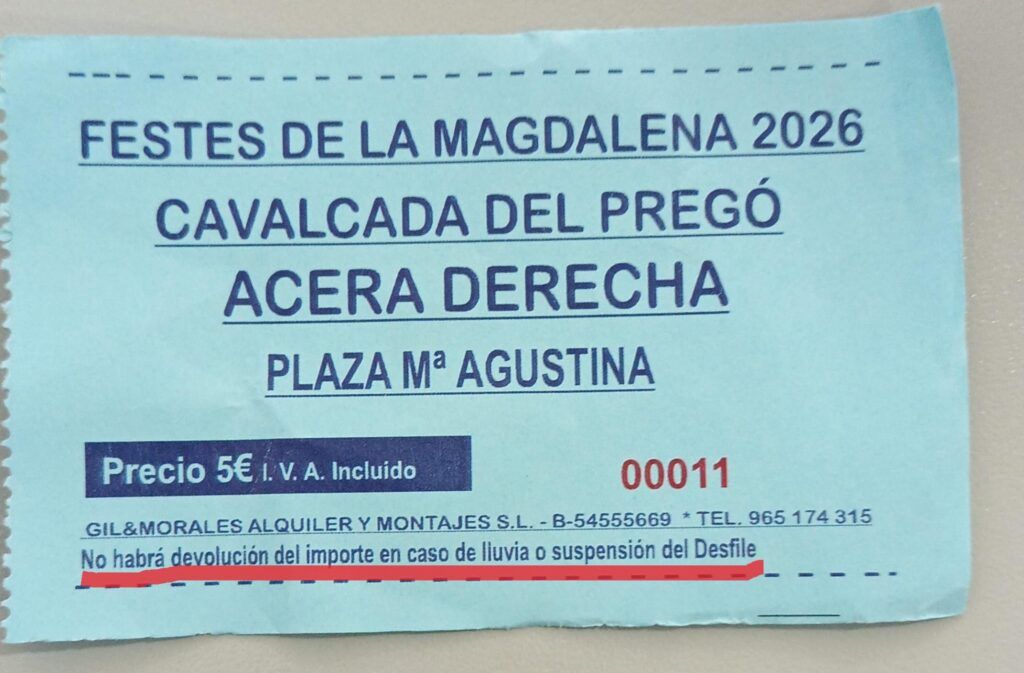 Aunque la letra pequeña del ticket lo detalla, no son pocas las consultas por devoluciones de dinero de las sillas del ‘Pregó’. Cada recibo que acredita el pago de 5 euros ya indica: «no habrá devolución del importe en caso de lluvia o suspensión del desfile». Sin embargo hay quien cuestiona ¿que pasa con un ‘Pregó pospuesto que finalmente sí que se celebra aunque ‘en versión reducida?’. Y en especial cuando una parte de las sillas que fueron colocadas y luego retiradas y apiladas se volvieron a poner cuando se anunció que sí que habría desfile.