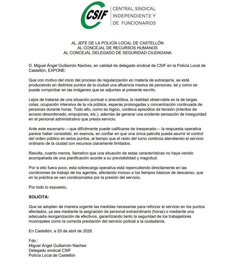 Aunque no es la primera vez que alguno de los sindicatos denuncian la falta de recursos de la Policía Local de Castellón, en esta ocasión la situación resulta más evidente a ojos de la ciudadanía. Algunas de las colas que a primera hora de este lunes se han formado para regularizar la situación de personas inmigrantes son más que visibles. Quizás por eso resulta más fácil entender el trabajo de los agentes cuando es una única patrulla la que debe vigilar que todo se desarrolle con normalidad.
