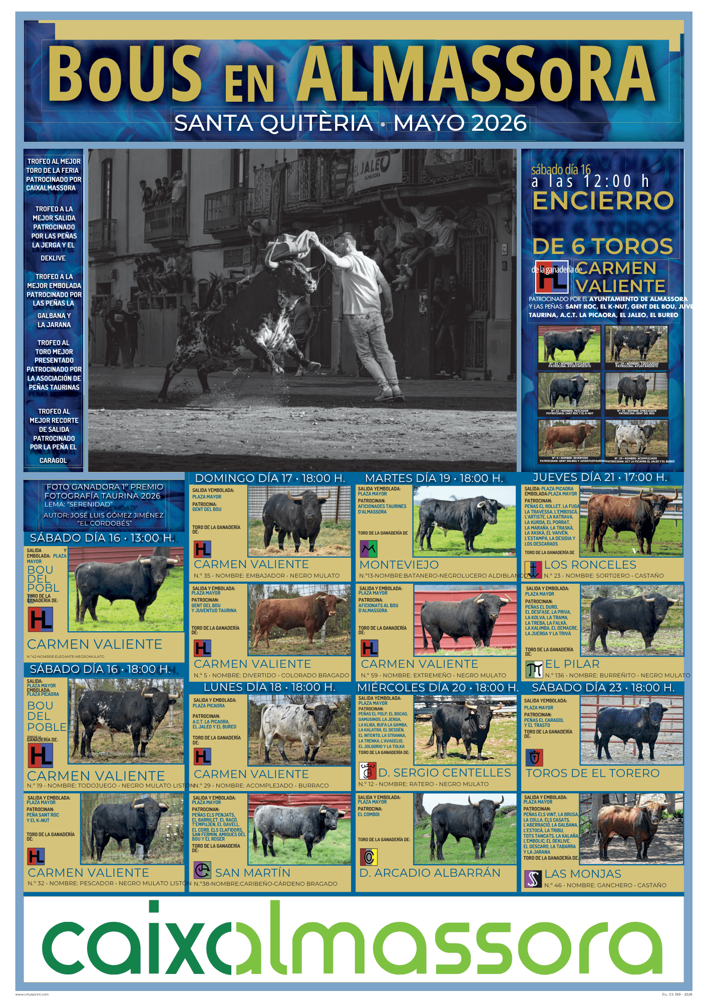 Los astados serán: Elegante (nº 42), patrocinado por el Ayuntamiento; Todojuego (nº 19), patrocinado por el Ayuntamiento; Pescador (nº 32), patrocinado por las peñas Sant Roc y El K-Nut; Embajador (nº35), patrocinado por Gent del Bou; Divertido (nº 5), patrocinado por Gent del Bou y Juventud Taurina; y Acomplejado (nº 29), patrocinado por A.C.T. La Picaora, El Jaleo y El Bureo.
