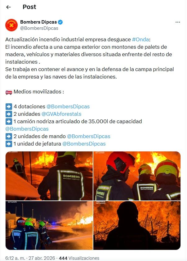 Según las últimas informaciones oficiales del Consorcio de Bomberos de la Diputación, a las 6:11 de esta mañana, los bomberos siguen trabajando en contener el incendio industrial de Onda que se ha iniciado esta madrugada. El objetivo más inminente es impedir que el fuego llegue a la campa central.
