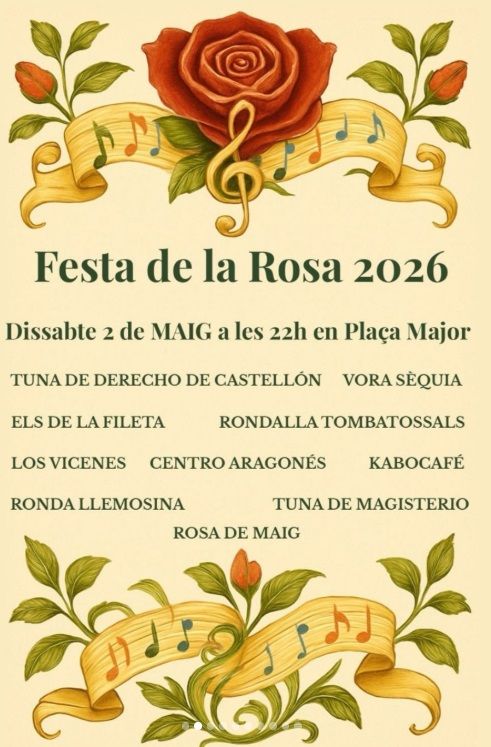 La Festa de la Rosa regresa de nuevo a Castellón abriendo el mes de las rondas por excelencia. La cita inaugural será este sábado 2 de mayo, en un acto en la plaza Mayor. Esa noche actuarán algunos de los grupos de ronda más legendarios de Castellón. Será a las 22:00 horas. En total, sobre el escenario, participarán más de un centenar artistas de agrupaciones locales.