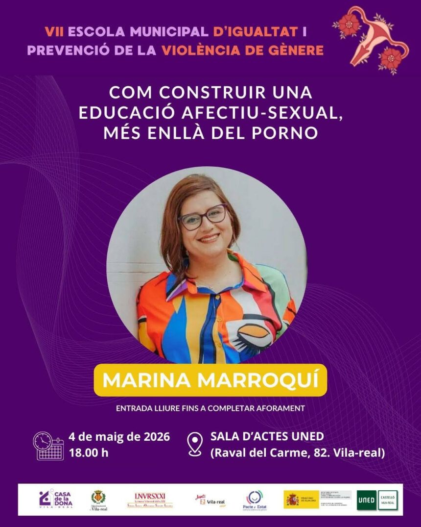 La conferència ajornada de Marina Marroquí ja té nova data. Serà este pròxim dilluns 4 de maig. La xarrada s’emmarca dins la 5a sessió de l’Escola Municipal d’Igualtat i Prevenció de la Violència de gènere. La ponència porta el títol de ‘Com construir una educació afectiu-sexual, més enllà del porno‘.