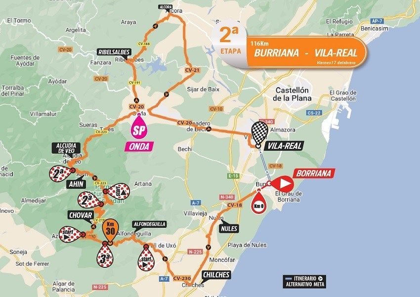 • El divendres 17 de febrer cap a les 13.30 hores es farà l’eixida de la segona etapa des de Borriana amb un recorregut de 117 quilòmetres amb trams de muntanya com el Marianet (3a), Eslida (2a) i Aín (2a), per a finalitzar a Vila -real